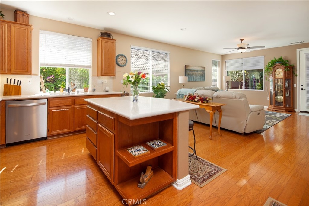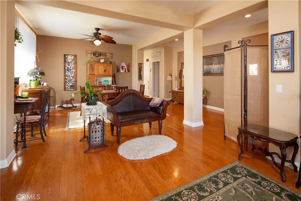 Welcome home to the most stunning home in the prestigious 55 and better community of The Four Seasons. This immaculate single story, two bedroom, two bath home has it all! From the moment you pull up to the home you are greeted by a gorgeous brick and concrete walkway with beautiful landscaping surrounding the adorable front balcony. Once inside the home, real wood floors lead the way through the spacious floor-plan, featuring custom paint, tall baseboards and high ceilings. The formal dining room and formal living room are large and have access to the french doors overlooking the front yard. The upgraded kitchen is appointed with granite counters, kitchen island, brand new stainless steel appliances and opens to the family room. The family room boasts a built-in entertainment center perfect for books or decor items and leads the way to the private backyard. Just off the kitchen is the laundry room with storage and sink. The secondary bedroom is spacious with plush carpet and ceiling fan, and the secondary bath features a tub/shower combo single vanity and tile flooring. The large master boasts plush carpet, custom paint, french doors that open to the yard, a walk-in closet and master bath with standing shower, and dual vanity. The quiet yard is appointed with an oversized patio cover featuring ceiling fans, large patio and plush grass with plenty of beauty surrounding it. The home backs up to the community center featuring pool, spa, tennis, bocce ball, clubhouse and more.
